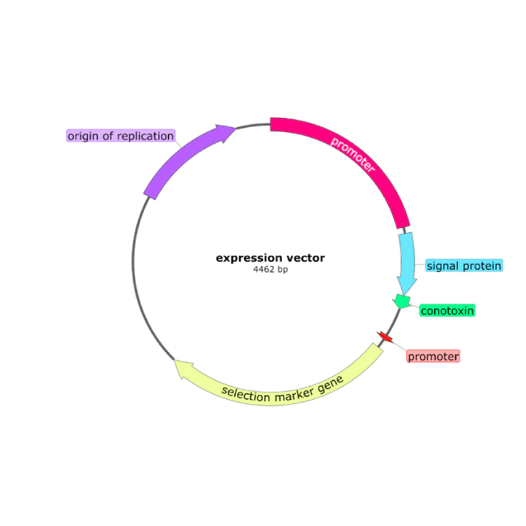 Recombinant conotoxin is created as a fusion protein from recombinant genes, i.e. DNA molecules - deoxyribonucleic acid, which is the most common carrier of genetic information. Gene expression in bacterial cells is possible thanks to the use of special expression vectors with a strong promoter enabling the production of large amounts of protein in the recipient cell.