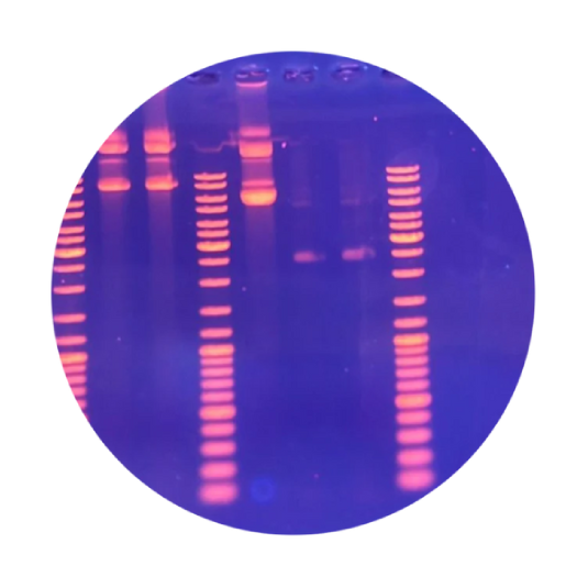 By comparing the bands from the tested sample with the standard bands, we are able to determine the size of DNA molecules in the tested sample. The agarose gels with electrophoretically separated DNA fragments obtained in our laboratory are made visible thanks to a dye that binds to deoxyribonucleic acid and then glows under the influence of UV light.